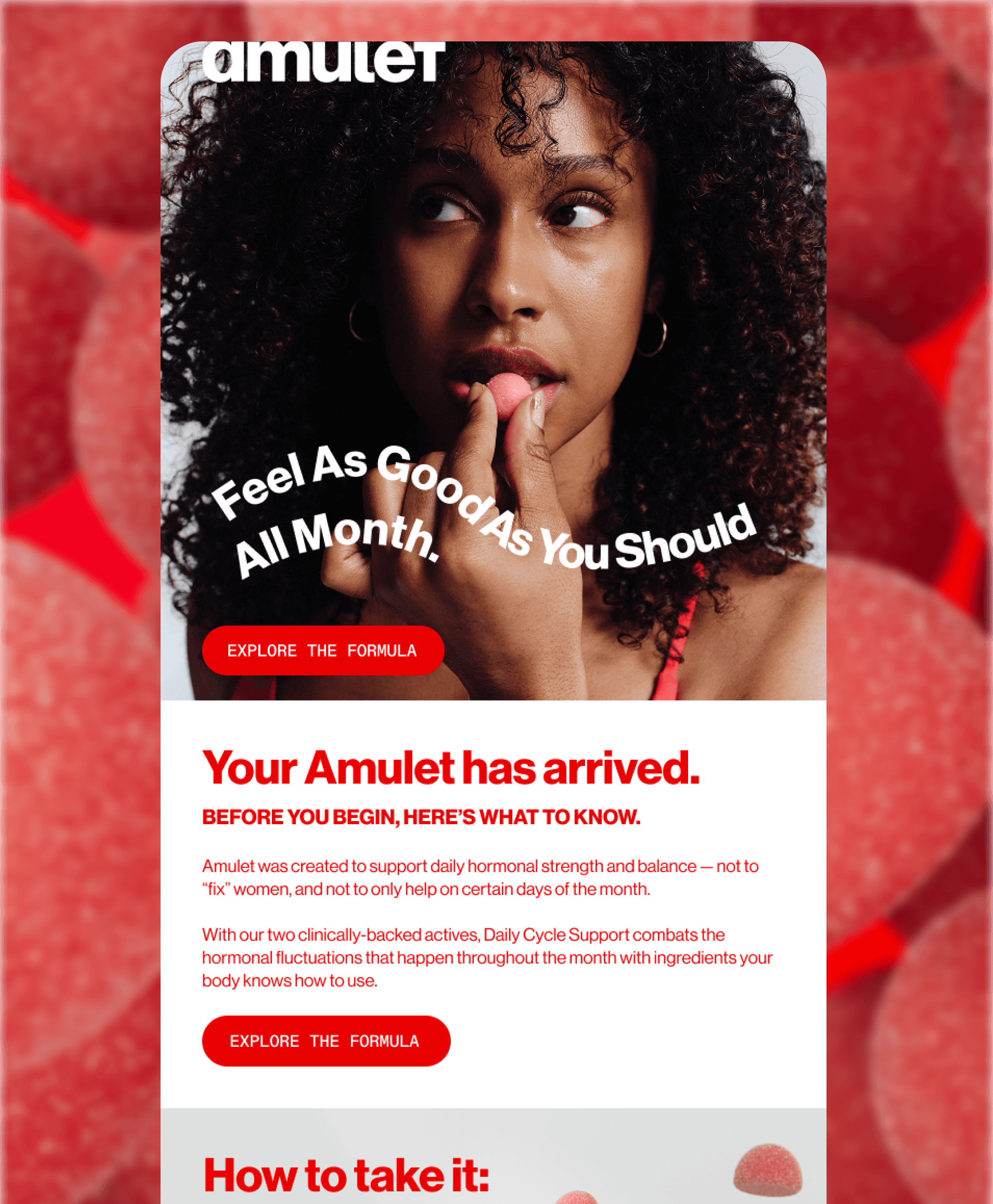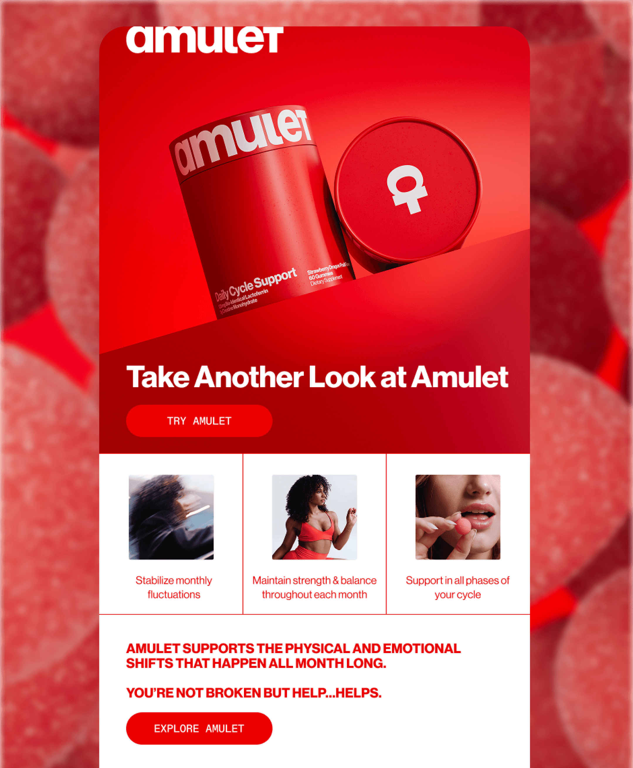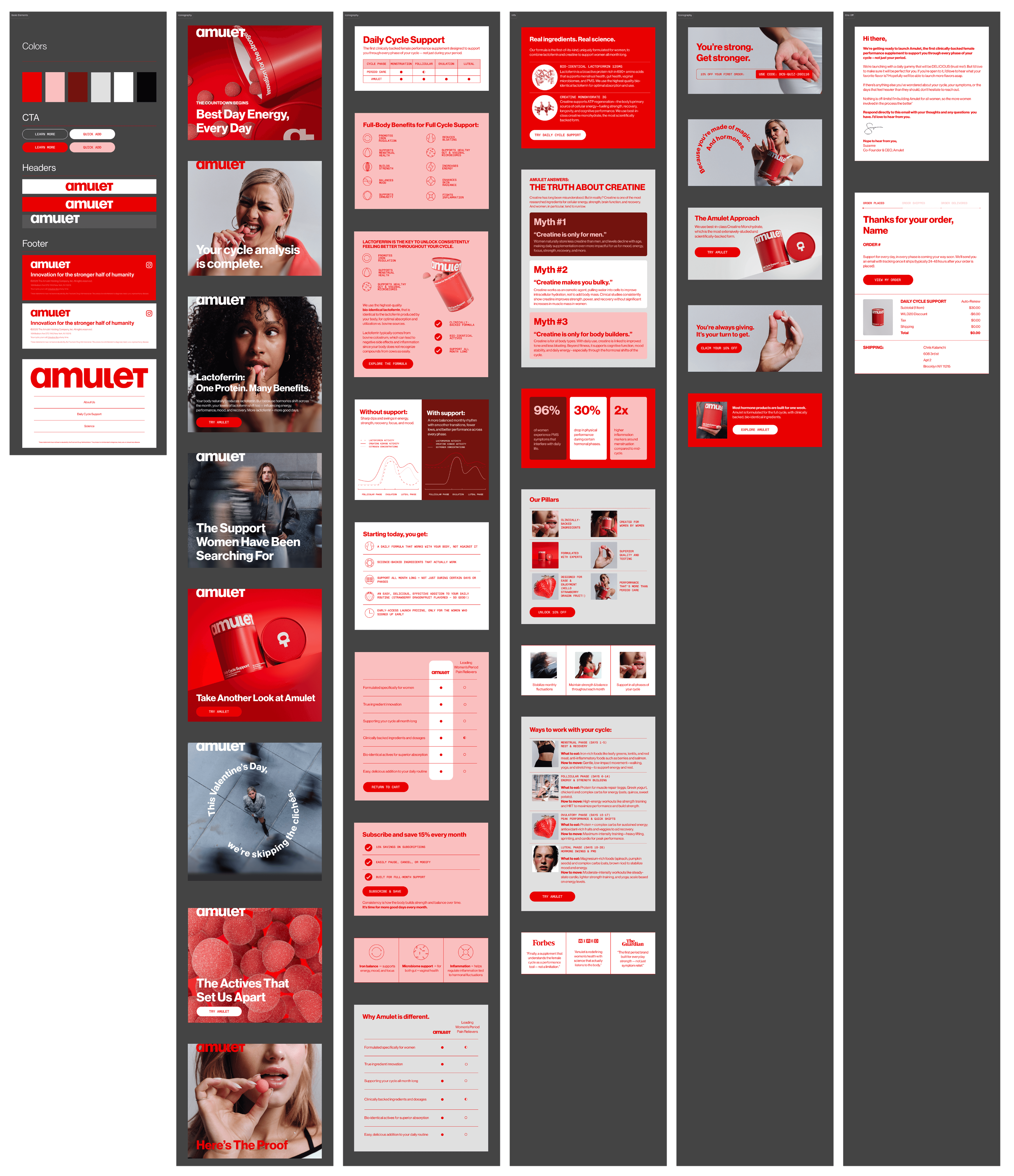 AMULET — VISUAL SYSTEM AND LAUNCH CAMPAIGN FOR A NEW WOMEN'S PERFORMANCE SUPPLEMENT BRAND. BUILT THE FOUNDATIONAL DESIGN LANGUAGE AND ROLLED IT OUT ACROSS THE LAUNCH ECOSYSTEM: BRAND CAMPAIGN EMAILS, EDUCATIONAL CONTENT, PRODUCT MARKETING, COMPARISON AND PROOF MODULES, TRANSACTIONAL FLOWS, AND A FOUNDER LETTER. ONE SYSTEM, BUILT TO SCALE FROM HERO LAUNCH MOMENT THROUGH EVERYDAY CUSTOMER COMMUNICATION.